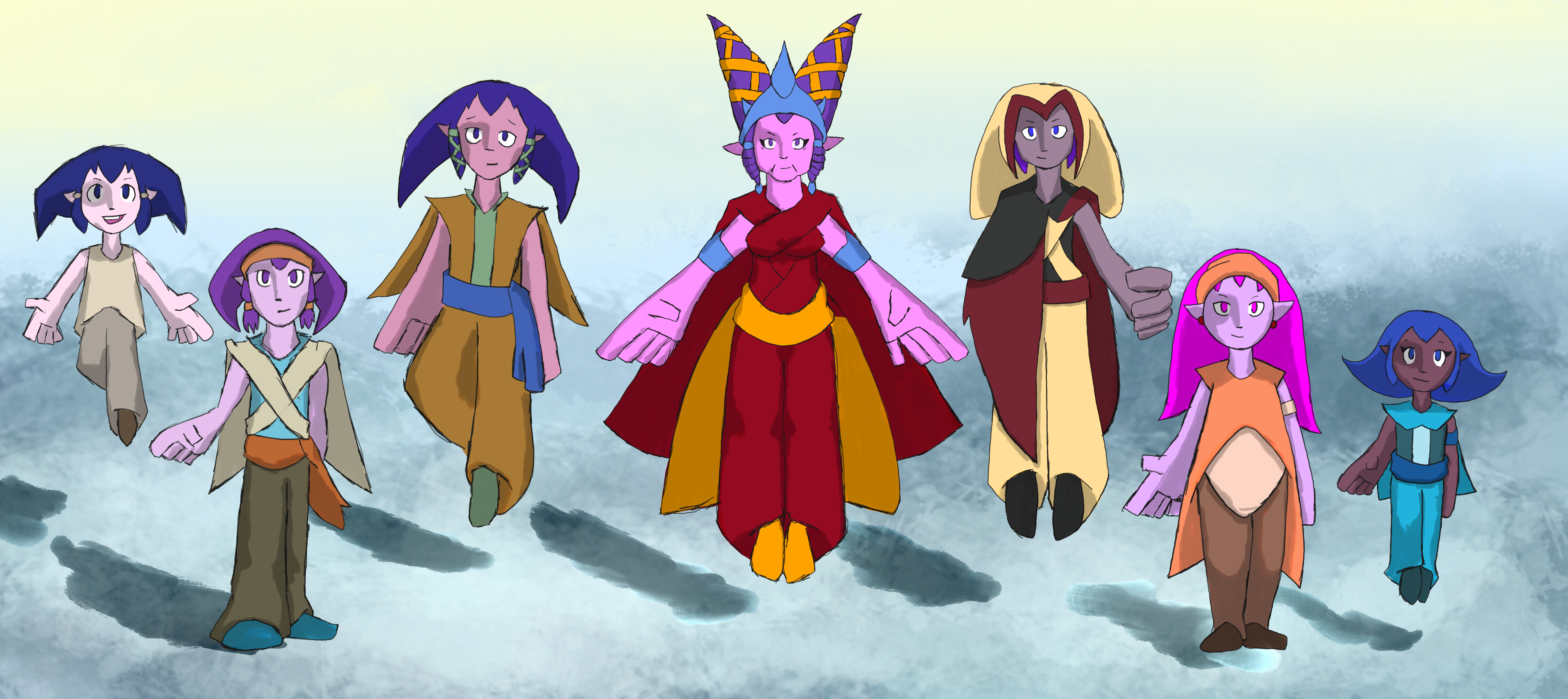 On their appearance: Of basal form, their skin color ranges across various tints and shades of light pink, lilac, and mauve. Their hair and eye colors are bright purples and magentas. Their hair parts into two points, reminiscent of a jester’s hat or a barn swallow’s tail. Their hair is a bit stiff; female hair has a gentle curve, while male hair has a bend. Their nose is straight and solid. They have flat forearms and hands, with five wide and flat fingers. They have pointed ears. They can naturally levitate. They wear flowy and loose clothing, like sleeveless shirts, belts, wraps, sashes, bell-bottom pants, jester hats, and cloth shoes. They also wear a wide variety of capes. The colors of their clothing range from various pastels, with some vibrant colors for accent. Blacks and darker colors are reserved for military attire. They also wrap their hair in decorative ribbons.